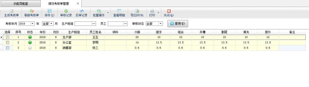 批量操作:在工具欄點擊“批量操作”可以進入批量操作模式,可以進行批量審核、批量反審考核單的操作。