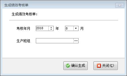 生成績效考核單:點擊“生成考核單”按鈕,可以彈出生成績效考核單窗口,在此窗口可以選擇年度、月份及相應的生產(chǎn)班組,然后點擊“確認生成”按鈕即可生成相應的績效考核單,如圖所示: