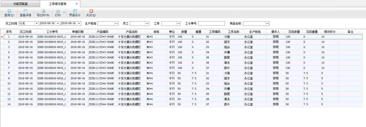 查詢:可以根據(jù)完工時間、生產(chǎn)班組、員工、工序、工令單號、商品名稱等條件對工序績效記錄進行查詢。