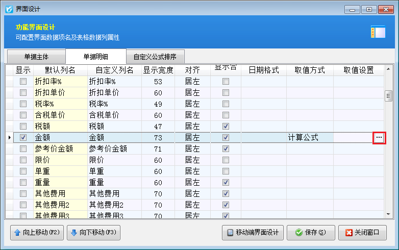 ????“單據(jù)明細(xì)”中的數(shù)據(jù)項(xiàng),如果是日期類型,可以配置日期的顯示格式;部分?jǐn)?shù)據(jù)項(xiàng)還可以設(shè)置從“基礎(chǔ)資料”或“數(shù)據(jù)字典”中獲取數(shù)值;數(shù)量、單價(jià)、金額及擴(kuò)展數(shù)值數(shù)據(jù)項(xiàng)還支持設(shè)置從計(jì)算公式中取值。在自定義公式排序標(biāo)簽頁(yè)可以對(duì)已設(shè)置的計(jì)算公式設(shè)置計(jì)算順序。