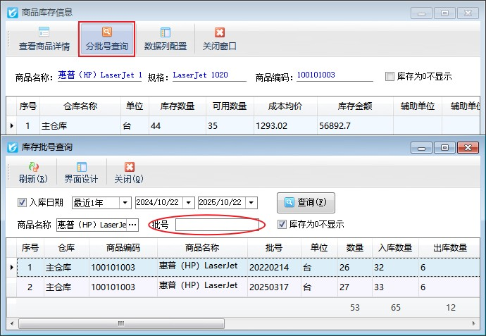 (6)查看庫(kù)存:點(diǎn)擊“查看庫(kù)存”按鈕,可查看當(dāng)前商品不同倉(cāng)庫(kù)的庫(kù)存信息;若商品存在不同批號(hào)可以分批號(hào)查詢商品庫(kù)存信息。