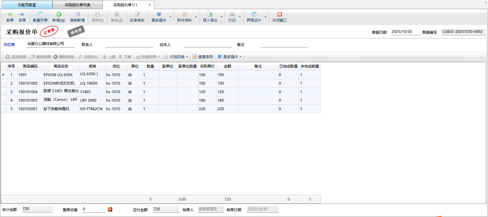 新增采購(gòu)?fù)素泦危?/strong>在工具欄點(diǎn)擊“新增”—“采購(gòu)?fù)素泦巍奔纯纱蜷_(kāi)新增采購(gòu)?fù)素泦谓缑妗?/p> 刪除:在工具欄點(diǎn)擊“刪除”按鈕可以刪除未審核的采購(gòu)入庫(kù)單/采購(gòu)?fù)素泦危绻麊螕?jù)已審核則不允許直接刪除。已審核的業(yè)務(wù)單據(jù)可以紅沖(在業(yè)務(wù)單據(jù)窗口點(diǎn)“更多操作”—》“紅沖”)后,然后再刪除。 復(fù)制新增單據(jù):點(diǎn)工具欄中的“復(fù)制新增”按鈕,可以復(fù)制當(dāng)前單據(jù)的數(shù)據(jù)為新單據(jù),新單據(jù)需要點(diǎn)“保存”按鈕才會(huì)實(shí)際保存到數(shù)據(jù)庫(kù)。 查看單據(jù):點(diǎn)擊工具欄中的“查看單據(jù)”按鈕可以查看當(dāng)前單據(jù)的詳細(xì)信息。 審核:點(diǎn)擊工具欄中的“審核”按鈕可以審核未審核的采購(gòu)入庫(kù)單/采購(gòu)?fù)素泦巍?/p> 批量操作:點(diǎn)擊“批量操作”按鈕后,進(jìn)入批量操作模式,可以打勾選擇要操作的采購(gòu)入庫(kù)單/采購(gòu)?fù)素泦危缓髨?zhí)行批量刪除、批量打印業(yè)務(wù)單據(jù)等操作。 查看付款情況:在工具欄“單據(jù)操作”下面點(diǎn)擊“查看付款情況”可以查看此單對(duì)應(yīng)的應(yīng)付款和付款結(jié)銷情況。 標(biāo)記備注:在工具欄“單據(jù)操作”下面點(diǎn)擊“標(biāo)記備注”可以對(duì)單據(jù)進(jìn)行備注。 標(biāo)記為已打印/未打印:在工具欄“單據(jù)操作”下面點(diǎn)擊“標(biāo)記為已打印/未打印”可以簡(jiǎn)單標(biāo)記一下單據(jù)的打印狀態(tài)。 紅沖單據(jù):在工具欄“單據(jù)操作”下面點(diǎn)擊“紅沖單據(jù)”可以紅沖不需要的已審核的業(yè)務(wù)單據(jù)。 查詢:可以根據(jù)單據(jù)日期、單據(jù)狀態(tài)、打印狀態(tài)、單據(jù)編號(hào)、供應(yīng)商、經(jīng)手人、單據(jù)類別等條件查詢業(yè)務(wù)單據(jù)。 高級(jí)查詢:點(diǎn)“高級(jí)查詢”按鈕支持更多條件進(jìn)行業(yè)務(wù)單據(jù)查詢。 導(dǎo)入導(dǎo)出:在工具欄中點(diǎn)擊“導(dǎo)入導(dǎo)出”可以導(dǎo)入采購(gòu)入庫(kù)單或采購(gòu)?fù)素泦危部梢詫⒉少?gòu)單列表數(shù)據(jù)導(dǎo)出為Excel文件,也可以導(dǎo)出稅控開(kāi)票數(shù)據(jù)XML。 打印:點(diǎn)“打印”—》“打印采購(gòu)單”可以快速打印采購(gòu)單;點(diǎn)“批量打印采購(gòu)單”可以批量打印采購(gòu)單(需啟用批量操作模式);點(diǎn)“采購(gòu)單打印格式設(shè)計(jì)”可以設(shè)置打印格式,有關(guān)打印格式模板設(shè)計(jì)的詳細(xì)操作說(shuō)明參見(jiàn)打印格式模板設(shè)計(jì)專門手冊(cè)。 界面設(shè)計(jì):點(diǎn)“界面設(shè)計(jì)”可配置界面數(shù)據(jù)項(xiàng)名及表格數(shù)據(jù)列屬性;點(diǎn)“界面設(shè)計(jì)”—》“移動(dòng)端界面設(shè)計(jì)”可以配置移動(dòng)端界面顯示的數(shù)據(jù)項(xiàng);點(diǎn)“客戶平臺(tái)訂單列表”可以配置外部客戶端界面顯示的數(shù)據(jù)項(xiàng),外部客戶界面設(shè)計(jì)默認(rèn)顯示移動(dòng)端的顯示設(shè)計(jì)。點(diǎn)擊進(jìn)入界面設(shè)計(jì)界面,可進(jìn)行導(dǎo)入導(dǎo)出配置數(shù)據(jù)(文本文件)操作:“導(dǎo)入配置數(shù)據(jù)”可以導(dǎo)入其他單據(jù)的配置數(shù)據(jù);“導(dǎo)出配置數(shù)據(jù)”可以導(dǎo)出單據(jù)的配置數(shù)據(jù);“導(dǎo)出配置(文本文件)”可以導(dǎo)出單據(jù)的配置文本文件(注:只有系統(tǒng)管理員賬號(hào)可以導(dǎo)入導(dǎo)出配置數(shù)據(jù)文件)。 ????采購(gòu)報(bào)價(jià)單用于管理采購(gòu)詢價(jià)信息,相對(duì)于采購(gòu)訂單,報(bào)價(jià)單的采購(gòu)意向更弱。在采購(gòu)訂單和采購(gòu)入庫(kù)單中可以調(diào)取引用采購(gòu)報(bào)價(jià)單。 ????在功能導(dǎo)航窗點(diǎn)“采購(gòu)管理”—》“采購(gòu)報(bào)價(jià)單”即可進(jìn)入“采購(gòu)報(bào)價(jià)單列表”界面,如下圖所示: 新增采購(gòu)報(bào)價(jià)單:在工具欄點(diǎn)擊“新增”,即可打開(kāi)新增采購(gòu)報(bào)價(jià)單界面。 刪除:在工具欄點(diǎn)擊“刪除”按鈕可以刪除未審核的采購(gòu)報(bào)價(jià)單,如果單據(jù)已審核則不允許直接刪除。已審核的業(yè)務(wù)單據(jù)可以紅沖(在業(yè)務(wù)單據(jù)窗口點(diǎn)“更多操作”—》“紅沖單據(jù)”)后,然后再刪除。 復(fù)制新增單據(jù):點(diǎn)工具欄中的“復(fù)制新增”按鈕,可以復(fù)制當(dāng)前單據(jù)的數(shù)據(jù)為新單據(jù),新單據(jù)需要點(diǎn)“保存”按鈕才會(huì)實(shí)際保存到數(shù)據(jù)庫(kù)。 查看單據(jù):點(diǎn)擊工具欄中的“查看單據(jù)”按鈕可以查看當(dāng)前單據(jù)的詳細(xì)信息。 批量操作:點(diǎn)擊“批量操作”按鈕后,進(jìn)入批量操作模式,可以打勾選擇要操作的采購(gòu)報(bào)價(jià)單,然后執(zhí)行批量刪除、批量打印業(yè)務(wù)單據(jù)等操作。 更多操作:報(bào)價(jià)單支持生成采購(gòu)訂單或者直接生成采購(gòu)入庫(kù)單、支持報(bào)價(jià)單標(biāo)記備注、查看附件資料。 查詢:可以根據(jù)單據(jù)日期、打印狀態(tài)、供應(yīng)商、商品名