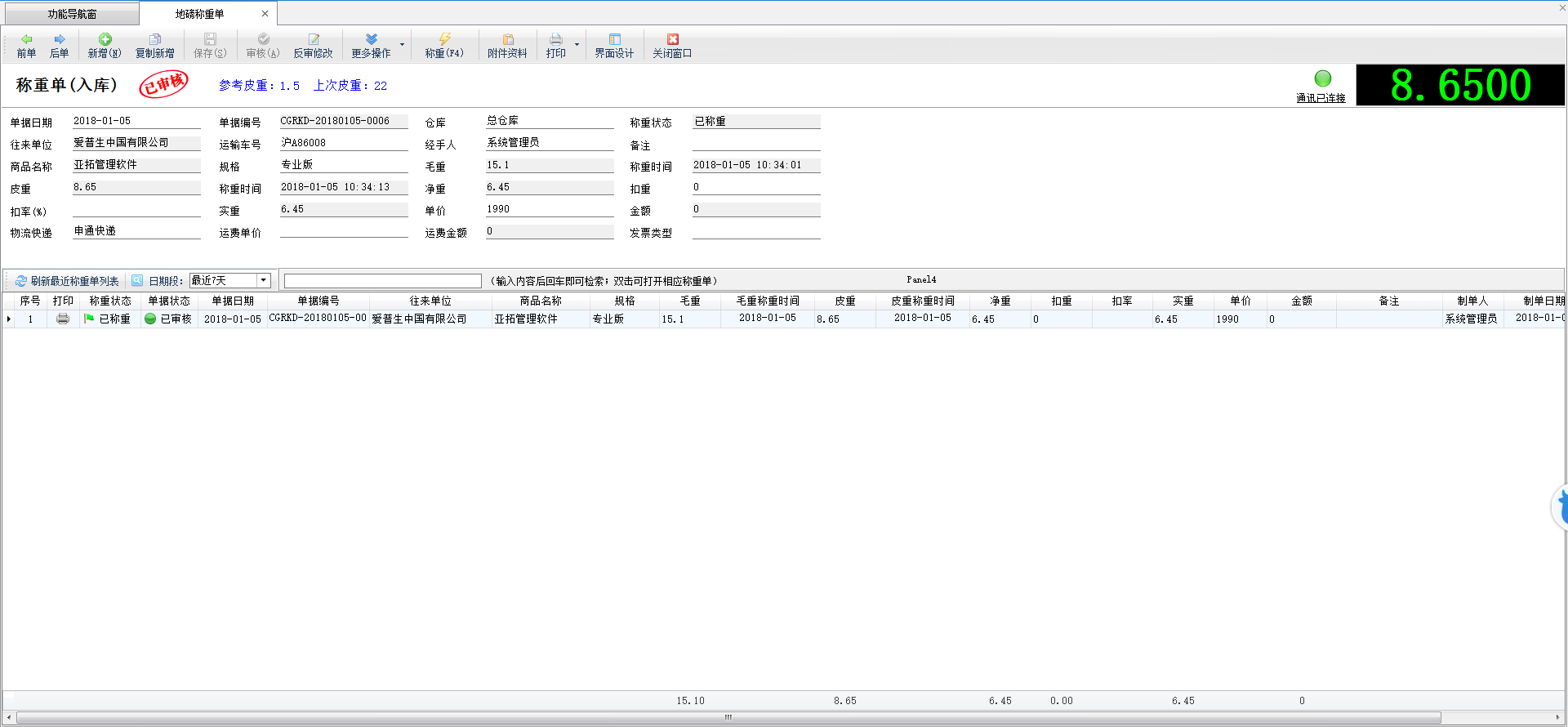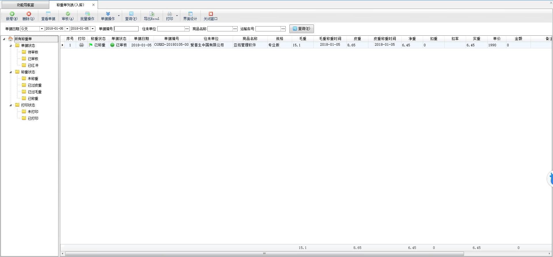 查看單據(jù):點(diǎn)擊工具欄中的“查看單據(jù)”按鈕可以查看當(dāng)前單據(jù)的詳細(xì)信息。 批量操作:點(diǎn)擊“批量操作”按鈕后,進(jìn)入批量操作模式,可以打勾選擇要操作的稱重入庫(kù)單,然后執(zhí)行批量刪除、批量打印業(yè)務(wù)單據(jù)等操作。 標(biāo)記為已打印/未打印:在工具欄“單據(jù)操作”下面點(diǎn)擊“標(biāo)記為已打印/未打印”可以簡(jiǎn)單標(biāo)記一下單據(jù)的打印狀態(tài)。 紅沖單據(jù):在工具欄“單據(jù)操作”下面點(diǎn)擊“紅沖單據(jù)”可以紅沖不需要的已審核的業(yè)務(wù)單據(jù)。 查詢:可以根據(jù)單據(jù)日期、單據(jù)狀態(tài)、稱重狀態(tài)、打印狀態(tài)、單據(jù)編號(hào)、往來(lái)單位、商品名稱、運(yùn)輸車號(hào)等條件查詢業(yè)務(wù)單據(jù)。 導(dǎo)出為 EXCEL:在工具欄中點(diǎn)擊“導(dǎo)出為 EXCEL”可以將采購(gòu)單列表數(shù)據(jù)導(dǎo)出為 Excel 文件。