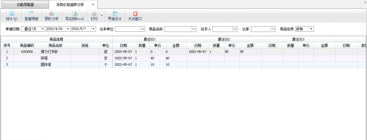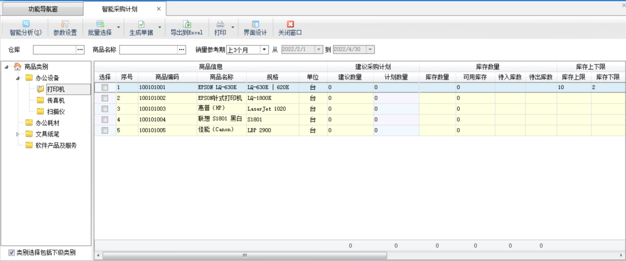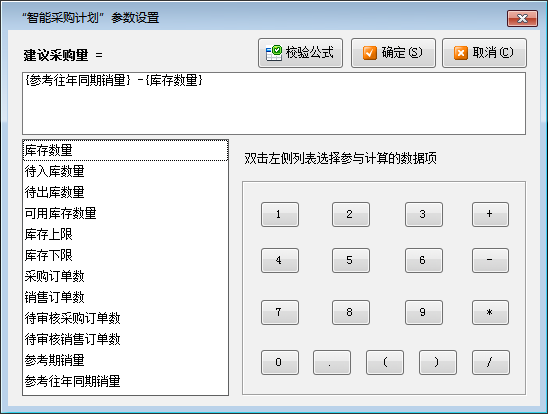 打印:點(diǎn)“打印”—》“打印稱重單”可以快速打印稱重入庫(kù)單;點(diǎn)“批量打印稱重單”可以批量打印稱重單(需啟用批量操作模式);點(diǎn)“稱重單打印格式設(shè)計(jì)”可以設(shè)置打印格式,有關(guān)打印格式模板設(shè)計(jì)的詳細(xì)操作說(shuō)明參見(jiàn)打印格式模板設(shè)計(jì)專門手冊(cè)。 界面設(shè)計(jì):軟件支持通過(guò)界面設(shè)計(jì)配置列表顯示的數(shù)據(jù)項(xiàng),并可調(diào)整數(shù)據(jù)項(xiàng)是否顯示、顯示順序、自定義數(shù)據(jù)項(xiàng)名稱、顯示寬度、對(duì)齊方式、是否必填等。 ????智能采購(gòu)計(jì)劃可根據(jù)當(dāng)前庫(kù)存情況,并可結(jié)合庫(kù)存上下限、同期銷售量、銷售訂單數(shù)量、待審核數(shù)量等條件進(jìn)行組合運(yùn)算,從而給出建議的商品采購(gòu)量。可以把建議結(jié)果生成為采購(gòu)訂單。 ????在功能導(dǎo)航窗點(diǎn)“采購(gòu)管理”—》“智能采購(gòu)計(jì)劃”即可進(jìn)入本功能,如下圖所示: ????以下為“智能采購(gòu)計(jì)劃”的功能操作說(shuō)明: (1)參數(shù)設(shè)置:可以設(shè)置“建議采購(gòu)量”的運(yùn)算公式,軟件將根據(jù)您設(shè)計(jì)的公式計(jì)算出建議數(shù)量。 ????雙擊“數(shù)據(jù)項(xiàng)列表”中的相應(yīng)數(shù)據(jù)項(xiàng),會(huì)插入數(shù)據(jù)項(xiàng)到公式文本框中,點(diǎn)擊數(shù)字按鈕和加減乘除按鈕,可以插入符號(hào)到公式文本框中。 ????設(shè)置完公式后,請(qǐng)先點(diǎn)“校驗(yàn)公式”按鈕,校驗(yàn)公式是否合法有效,如果提示公式錯(cuò)誤,請(qǐng)重新設(shè)置后再點(diǎn)“確定”按鈕保存。 (2)智能分析:點(diǎn)“智能分析”按鈕,軟件會(huì)根據(jù)參數(shù)設(shè)置中設(shè)置的采購(gòu)量運(yùn)算公式計(jì)算出商品的“建議數(shù)量”,默認(rèn)“計(jì)劃數(shù)量”(即后續(xù)生成訂單的數(shù)量)等于“建議數(shù)量”,您可根據(jù)業(yè)務(wù)情況,再手工調(diào)整“計(jì)劃數(shù)量”。 (3)批量選擇:點(diǎn)“批量選擇”按鈕,可以對(duì)列表信息進(jìn)行全選,反選,全不選操作。 (4)生成單據(jù):點(diǎn)“生成單據(jù)”按鈕,軟件會(huì)將列表中“計(jì)劃數(shù)量”不為空的記錄生成為采購(gòu)訂單。 單據(jù)中心:可根據(jù)單據(jù)日期、單據(jù)編號(hào)、單據(jù)類別、往來(lái)單位、商品、審核狀態(tài)等各種條件查詢業(yè)務(wù)單據(jù)記錄。 采購(gòu)訂單查詢:可根據(jù)訂單日期、訂單編號(hào)、往來(lái)單位、商品名稱、執(zhí)行狀態(tài)、審核狀態(tài)等各種條件查詢相應(yīng)的采購(gòu)訂單記錄。 采購(gòu)訂單明細(xì)查詢:可根據(jù)各類條件查詢采購(gòu)訂單明細(xì)記錄,包括訂單信息和訂單包括的明細(xì)信息(商品、價(jià)格等信息)。點(diǎn)“高級(jí)查詢”按鈕可使用更多查詢條件查詢。點(diǎn)“界面設(shè)計(jì)”可以配置顯示的數(shù)據(jù)列。 采購(gòu)訂單統(tǒng)計(jì):可以從商品、經(jīng)手人、往來(lái)單位三種角度匯總采購(gòu)訂貨情況、已發(fā)貨情況、未發(fā)貨情況和中止情況。點(diǎn)“統(tǒng)計(jì)方式”可以選擇具體的統(tǒng)計(jì)方式,默認(rèn)會(huì)按照商品進(jìn)行統(tǒng)計(jì)。 采購(gòu)訂單執(zhí)行情況:可以統(tǒng)計(jì)出每個(gè)采購(gòu)訂單執(zhí)行情況,包括合計(jì)金額、已完成金額、未完成金額以及中止金額等信息。 采購(gòu)訂單交貨提醒:可根據(jù)交貨日期查看采購(gòu)訂單商品的交貨狀態(tài)。 采購(gòu)單匯總表:可根據(jù)單據(jù)日期、往來(lái)單位、商品、經(jīng)手人、倉(cāng)庫(kù)等條件,查詢采購(gòu)單記錄。采購(gòu)單匯總表中可以分開(kāi)統(tǒng)計(jì)采購(gòu)入庫(kù)單和采購(gòu)?fù)素泦巍?/p> 采購(gòu)單明細(xì)查詢:可根據(jù)單據(jù)日期、往來(lái)單位、商品、經(jīng)手人、倉(cāng)庫(kù)等條件,查詢采購(gòu)單明細(xì)記錄(即采購(gòu)商品明細(xì)記錄)。 采購(gòu)報(bào)價(jià)單查詢:可根據(jù)單據(jù)日期、單據(jù)編號(hào)、往來(lái)單位、商品、經(jīng)手人等條件,查詢采購(gòu)報(bào)價(jià)單記錄。 采購(gòu)報(bào)價(jià)單明細(xì)查詢:可根據(jù)單據(jù)日期、單據(jù)編號(hào)、往來(lái)單位、商品、經(jīng)手人等條件,查詢采購(gòu)報(bào)價(jià)單明細(xì)記錄(即報(bào)價(jià)商品明細(xì)記錄)。 稱重入庫(kù)單查詢:可根據(jù)單據(jù)日期、單據(jù)編號(hào)、往來(lái)單位、稱重狀態(tài)、商品名稱、經(jīng)手人、倉(cāng)庫(kù)、運(yùn)輸車號(hào)等條件,查詢稱重入庫(kù)單記錄。 費(fèi)用入庫(kù)單查詢:可根據(jù)單據(jù)日期、單據(jù)編號(hào)、往來(lái)單位、商品名稱、經(jīng)手人、倉(cāng)庫(kù)、單據(jù)狀態(tài)等條件,查詢費(fèi)用入庫(kù)單記錄。 采購(gòu)統(tǒng)計(jì)(按供應(yīng)商):可以匯總某個(gè)時(shí)間段內(nèi),從每個(gè)供應(yīng)商處采購(gòu)的商品匯總數(shù)量、采購(gòu)均價(jià)、金額、稅額以及優(yōu)惠情況。統(tǒng)計(jì)時(shí)支持按商品、按倉(cāng)庫(kù)、按經(jīng)手人等條件進(jìn)行統(tǒng)計(jì)。 采購(gòu)統(tǒng)計(jì)(按商品):可以