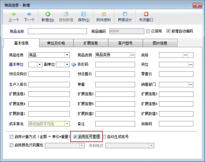 ????功能導航窗選擇“基礎資料”,打開商品信息界面,支持新增商品時勾選“啟用批號管理”,如下圖所示: