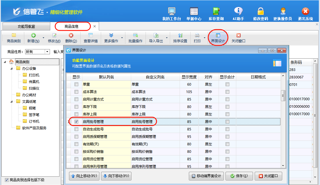 ????批量啟用需在商品信息列表中顯示出“啟用批號管理”數(shù)據(jù)項,操作步驟:商品信息列表界面,點擊工具欄“界面設計”,勾選數(shù)據(jù)項“啟用批號管理”并保存,如下圖所示: