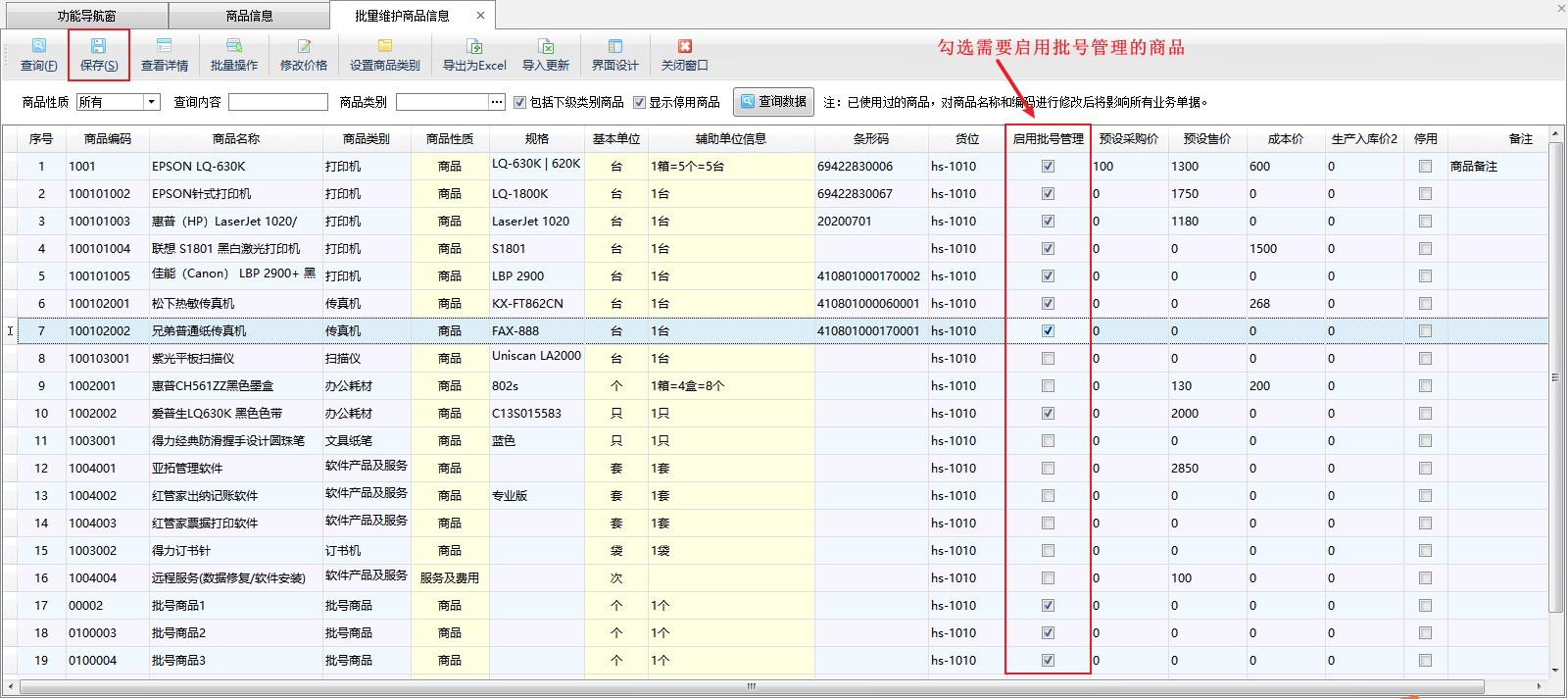 ????界面設計配置后在商品信息列表界面,工具欄點擊“更多操作”—》“批量維護商品信息”,進入“批量維護商品信息”界面,可批量勾選商品的“啟用批號管理”處,勾選完成后“保存”設置,如下圖所示: