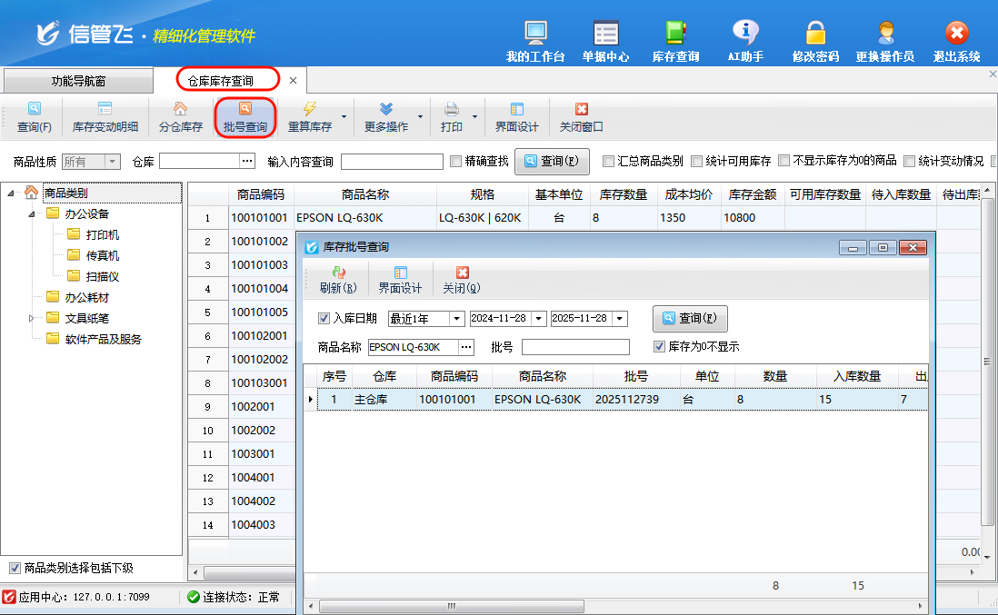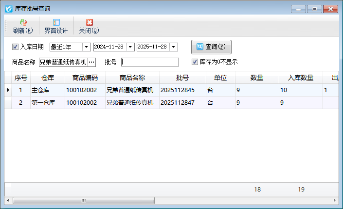 ????“庫存批號查詢”界面支持按入庫日期、商品名稱、批號等條件進行檢索。方便批號比較多時快速檢索出此批號商品。