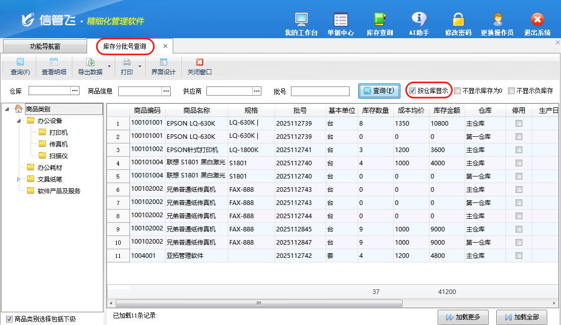????功能導航窗選擇“倉庫管理”,倉庫管理界面右側相關統(tǒng)計查詢中打開“庫存分批號查詢”。庫存分批號查詢界面顯示所有批號商品的庫存數(shù)量,默認按倉庫進行顯示,如下圖所示:
