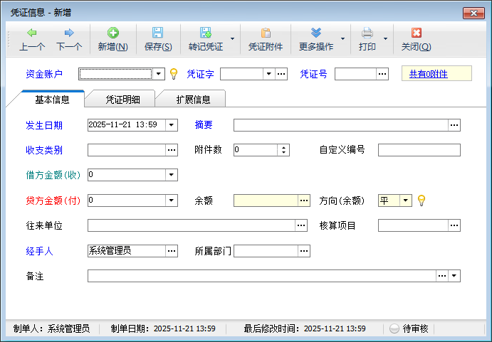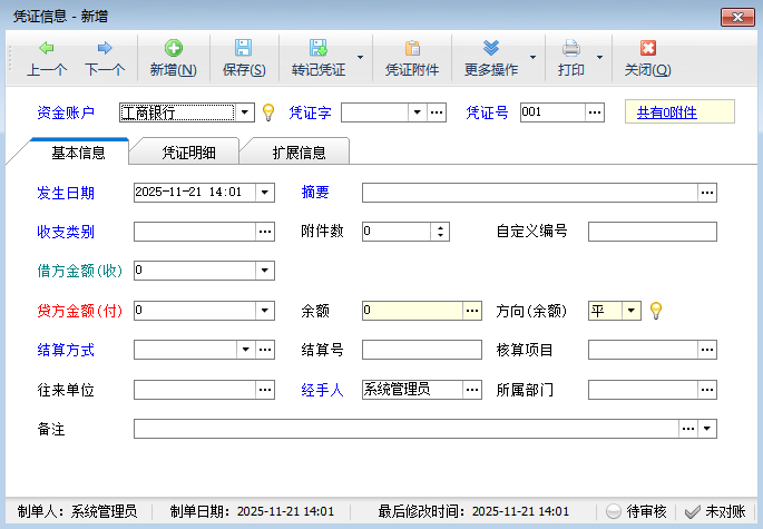 方向:保存憑證后,系統自動生成,不允許修改。此處指的是賬戶余額的方向,余額大于 0 為借,小于 0 方向為貸,等于 0 方向為平。