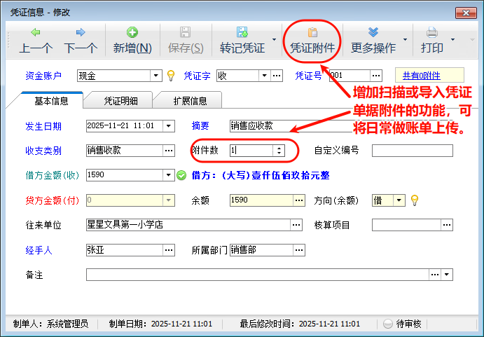 憑證附件:點擊“憑證附件”按鈕,可掃描或導入與憑證相關的電子文件。如下圖所示: