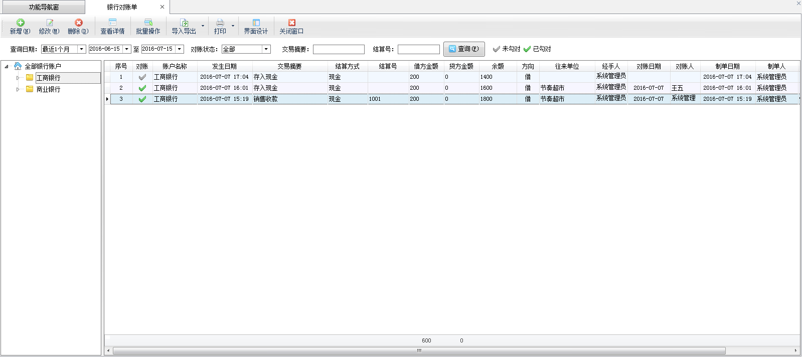 | 4 | 查看銀行對賬單 | 選擇一條銀行對賬記錄,然后點擊工具欄中的“查看詳情”按鈕,系統會彈出“查看銀行對賬單”界面,可以查看銀行對賬單的詳細信息。 |