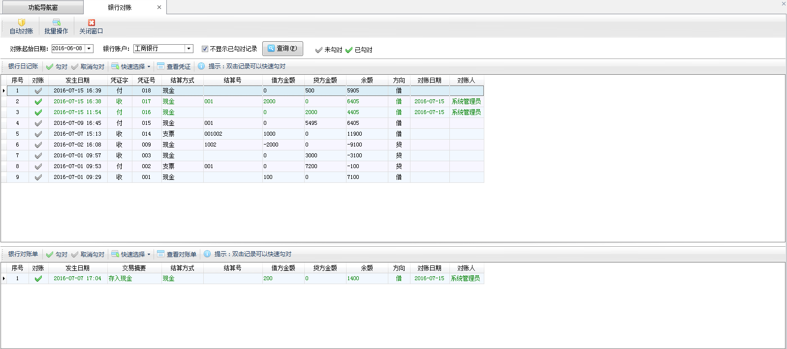 | 2 | 批量操作 | 在工具欄中點擊“批量操作”按鈕,系統會進行批量操作模式,可以選擇多個銀行日記賬或者銀行對賬單,進行批量勾對。 |