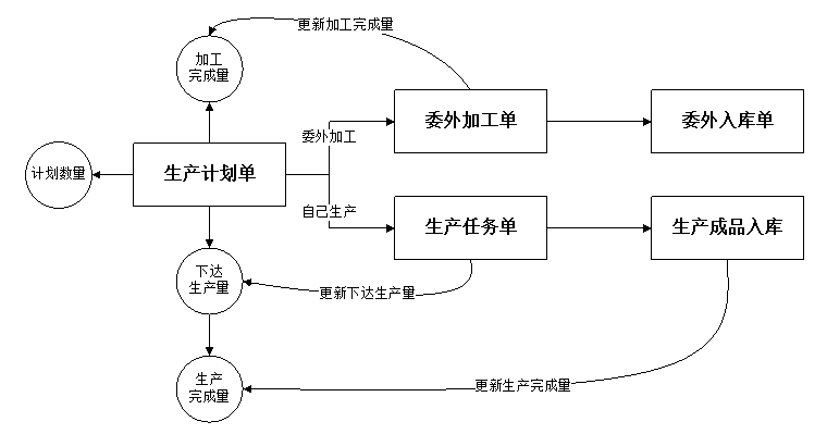 ????② 生產(chǎn)計劃明細中只能輸入計劃數(shù)量(即計劃生產(chǎn)數(shù)量),其他數(shù)量由后續(xù)單據(jù)執(zhí)行后自動更新。下圖為不同業(yè)務單據(jù)更新相應數(shù)量示意圖: