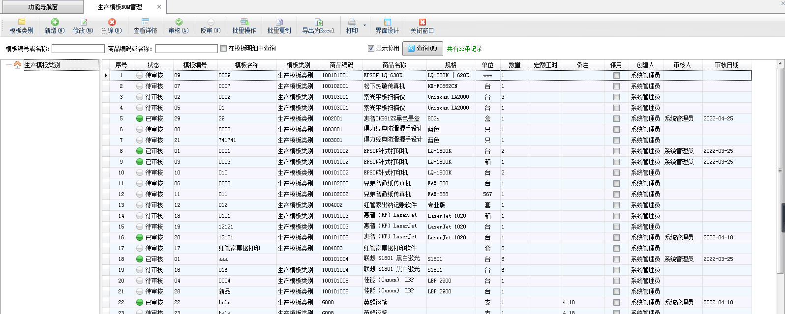 修改模板:點工具欄中的“修改”按鈕,可以對生產(chǎn)模板信息進行調(diào)整。