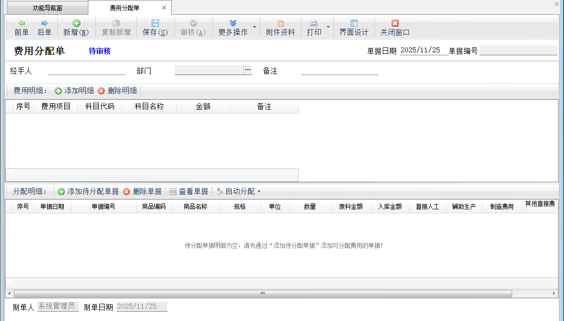 ????在功能導航窗,點“生產(chǎn)管理”—》“費用分配單”,即可進入費用分配單界面,如下圖所示: