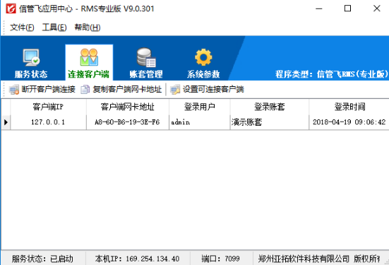 ????可以管理已連接到主機(jī)的客戶端電腦信息,包括客戶端IP、客戶端網(wǎng)卡地址、登錄操作員、登錄賬套以及登錄時(shí)間。