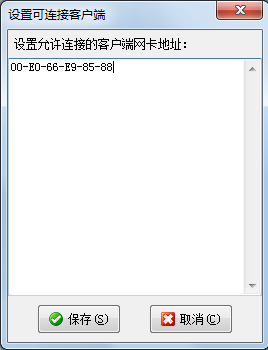 ????設(shè)置允許連接的客戶端網(wǎng)卡地址,每行一個(gè)網(wǎng)卡地址。客戶端的網(wǎng)卡地址可以在連接客戶端界面中點(diǎn)“復(fù)制客戶端網(wǎng)卡地址”進(jìn)行復(fù)制,也可以在“網(wǎng)絡(luò)和共享中心”中 “本地連接狀態(tài)”的詳細(xì)信息查看到。