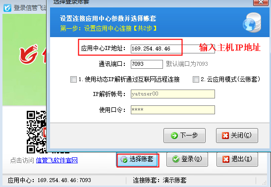 ????在客戶端程序登錄窗口點擊“選擇賬套”,輸入自購的云主機IP地址,點擊“下一步”后進入選擇賬套界面,選擇需要登錄的帳套即可,如下圖所示: