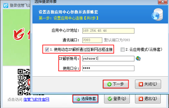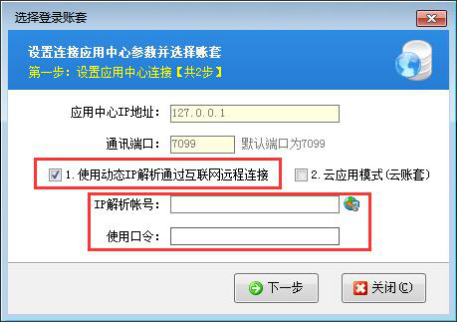 ????客戶端互聯網下登錄時,只打開客戶端程序,點擊“選擇賬套”,勾選啟用”動態IP解析服務“,輸入解析賬號和口令,下一步選擇賬套連接,如下圖所示: