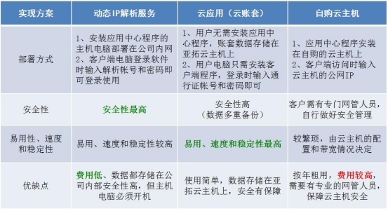 ????動態IP解析服務、云應用(云賬套)、自購云主機這三種方式都可以實現通過互聯網遠程使用信管飛軟件,三種方案的部署方式、安全性、易用性及優缺點對比如下圖所示: