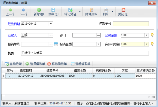 ????在個人借款管理界面,選擇需要核銷的單據進行還款核銷,還款核銷時填寫還款金額與報銷金額,如果公司全額報銷,則還款金額不用填寫,填寫報銷金額后直接保存,不用“轉記日記賬”;如果公司對本次借款是部分報銷,則填寫報銷金額和還款金額后,保存單據,然后“轉記日記賬”,把還款金額記入現金日記賬或者銀行日記賬憑證;如果公司對本次借款是不報銷,則報銷金額不用填寫,填寫還款金額后保存單據,然后“轉記日記賬”,把還款金額記入現金日記賬或者銀行日記賬憑證。