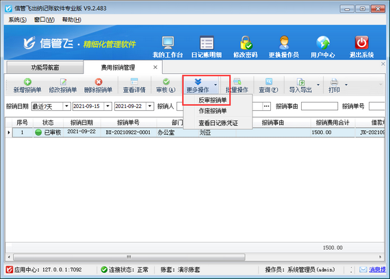 ????在功能導航窗點擊“綜合管理”—》“費用報銷管理”打開費用報銷管理界面,選擇一個已審核的費用報銷單,然后在工具欄點擊“更多操作”—》“反審報銷單”,系統會彈出提示信息“您確認要反審當前報銷單記錄嗎?”,點擊“確定”按鈕即可對已審核的費用報銷單進行反審操作,反審后,費用報銷單狀態變為“待審核”,此時可以對這個待審核的費用報銷單進行修改操作,如下圖所示。