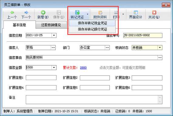????在員工借款管理界面工具欄點擊“新增借款單”,打開新增借款單界面可以錄入借款信息,借款信息填寫完成后保存借款單,借款單保存后,新增借款單界面工具欄點擊“轉記憑證”即可轉記現金及銀行憑證。