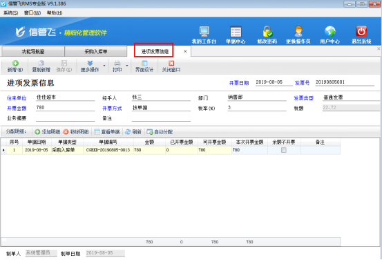 企業(yè)在開采購入庫單和銷售出庫單時都存在開發(fā)票的情況,信管飛RMS軟件發(fā)票管理功能可以讓企業(yè)高效快速地管理發(fā)票信息。發(fā)票管理功能支持對銷項(xiàng)發(fā)票的領(lǐng)購登記、使用(填開、作廢)等整個流程的管理,并能夠全面記錄銷項(xiàng)增值稅專用發(fā)票、銷項(xiàng)普通發(fā)票以及各種進(jìn)項(xiàng)發(fā)票的開具信息。 發(fā)票管理為擴(kuò)展模塊,只有信管飛RMS標(biāo)準(zhǔn)版和專業(yè)版支持附加使用。填開發(fā)票除了在發(fā)票管理中直接進(jìn)行新增,軟件也支持在開單界面直接填開發(fā)票操作。本文以信管飛RMS專業(yè)版的采購入庫單為例,講一下在采購入庫單中如何快速填開發(fā)票操作。