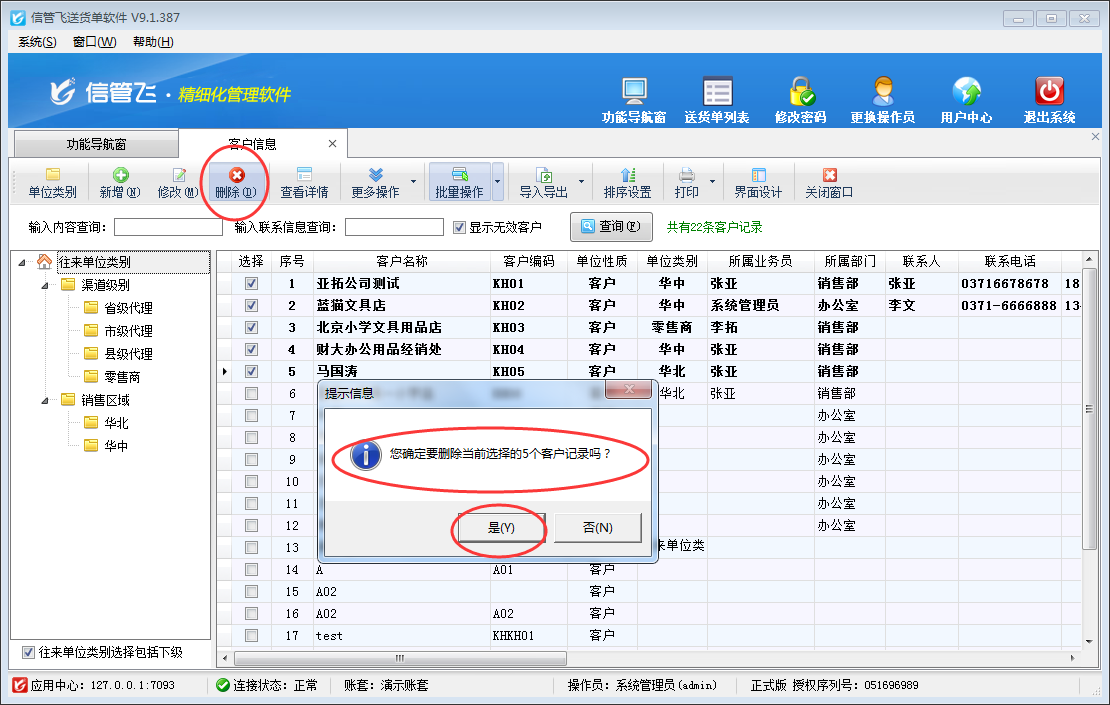 送貨單打印軟件支持維護(hù)客戶信息,出現(xiàn)客戶信息大范圍錄入錯誤時,軟件支持對錯誤客戶資料進(jìn)行批量刪除操作,避免一個一個刪除的麻煩。以信管飛送貨單軟件為例示范下如何操作? 在功能導(dǎo)航窗選擇“基礎(chǔ)資料”—》“客戶信息”進(jìn)入客戶信息管理界面,選擇工具欄的“批量操作”按鈕,進(jìn)入批量操作模式,選擇需要刪除的客戶信息(批量操作支持全選、全不選、反選),如下圖所示: 批量選擇客戶信息后,點(diǎn)擊工具欄的“刪除”按鈕,會提示“您確定要刪除當(dāng)前選擇的客戶記錄嗎?”,點(diǎn)擊“是”進(jìn)行批量刪除操作。如下圖所示:【注意