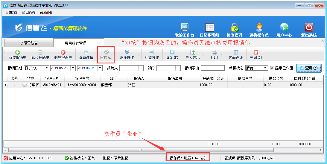 在日常工作中,因為臨時事件的發生,員工經常會自己墊付工作所需要的各項費用。這些費用在月末時可以填寫費用報銷單進行統一的報銷。信管飛出納記賬軟件專業版有費用報銷管理功能,可以管理費用報銷單,并支持設置操作員費用報銷單審核權限,下文我們詳細介紹一下出納記賬軟件內如何設置操作員不允許審核費用報銷單? 在功能導航窗點擊“系統管理”—》“操作員及授權”打開操作員管理及授權界面,選擇操作員“張亞”,在功能模塊權限界面,選擇“綜合管理”—》“費用報銷管理”,把費用報銷管理“審核”權限勾選取消后保存權限,如下圖一所示:圖一 &
