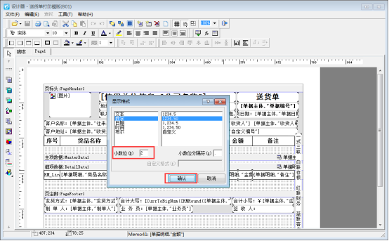 信管飛送貨單軟件、信管飛RMS軟件、信管飛倉庫管理軟件等都支持自定義設計打印模板。打印模板設計中默認金額的小數位顯示為2位,如果需要進行修改,可以在打印格式模板設計界面進行修改。 以信管飛送貨單軟件的模板為例,示范下如何修改模板中的金額小數位顯示格式。打開一個送貨單,在打印按鈕下選擇“打印格式設計”,在打印格式設計界面,選擇示例模板“送貨單打印模版(B01)”,點擊“設計格式”,進入模板設計器界面,如下圖所示: 在模板設計器界面。單擊“細項數據”中的