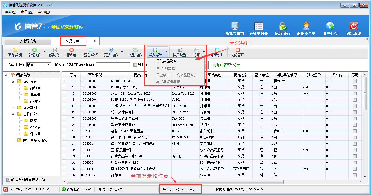 信管飛送貨單軟件、信管飛RMS、信管飛倉庫管理軟件等都支持管理基礎資料信息和允許設置多個操作員進行登錄軟件。軟件支持將基礎資料信息以EXCEL的形式導出放到自定義的文件夾內以供備份或保存,如果需要設置操作員不允許導出商品信息,如何設置?本文以信管飛送貨單軟件為例,示范下如何設置操作員不可導出商品信息。 在功能導航窗點擊“系統管理”—》“操作員及授權”打開操作員管理及授權界面,選擇操作員“張亞”,在功能模塊權限界面,選擇“基礎資料”—》“商品信息”,在導出權限下,把商品信息“導出”權限勾選取消后保存權限,如下圖1所示:圖1