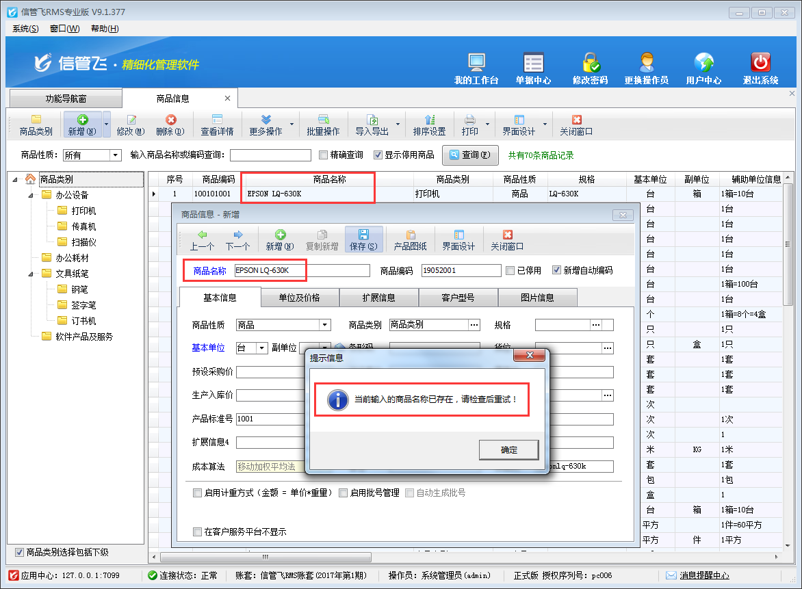 亞拓軟件自主研發的信管飛RMS、信管飛送貨單軟件、信管飛倉庫管理軟件等都支持新增商品信息,為了避免增加的商品信息出現重復,軟件支持參數設置商品名稱不可重復。 以信管飛RMS為例,在系統管理—》系統參數配置—》業務參數內將“數據可否重復參數”中的“商品名稱可重復”參數的勾選取消,然后保存設置。如下圖所示: 設置完成后,打開功能導航窗的“基礎資料”—》“商品信息”,新增一個商品,輸入和之前已有商品一樣的名稱,保存時系統會提示“當前輸入的商品名稱已存在,請檢查后重試!”,如下圖所示:&nbs