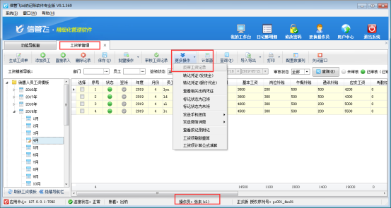 信管飛出納記賬軟件專業版,支持設置工資模板來管理員工工資單,為了避免操作員修改工資單,軟件中可以設置操作員的工資單不可反審修改權限。下邊我們在軟件中示范下如何設置操作員的此權限。 用系統管理員賬號登錄軟件后,在“系統管理”—》“操作員及授權”中,選擇操作員“張來”,在功能模塊權限下選擇綜合管理工資單管理,把工資單管理的“反審修改”的權限取消勾選,然后保存權限設置,如下圖1所示: 圖1 操作員權限保存成功后,返回登錄窗口,選擇操作員“張來”登
