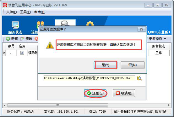 亞拓軟件旗下所有軟件安裝完成后,數據備份均保存在安裝軟件目錄下的賬套文件備份文件夾中,如需要更換電腦使用,需要把最近日期的備份數據復制到新的電腦上,在新的電腦上安裝好軟件,在應用中心程序中對之前的賬套備份數據進行還原操作,就可以把之前的所有數據同步到這個電腦上。 本文以“信管飛RMS軟件”為例,示范如何還原備份賬套數據。 首先,復制原電腦上的備份數據到新電腦上,把備份數據.dbk格式的文件復制到電腦桌面上,方便還原賬套進行選擇。打開應用中心程序(紅色