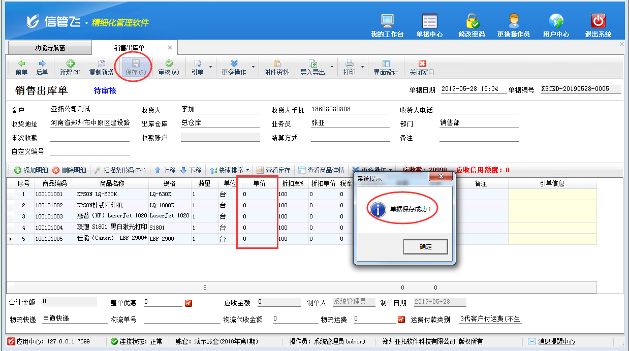 演示視頻觀看鏈接:如何設置出庫單保存時商品單價為0系統不彈出提示信息? 信管飛RMS、信管飛倉庫管理軟件、信管飛送貨單軟件等在業務單據保存時如果商品單價為0,系統會彈出提示信息,是否需要繼續保存,如下圖一所示,這樣以免用戶在添加商品明細時忘了填寫單價,好及時錄入,但是有一部分用戶在開單據時只需要填寫商品數量,不需要填寫單價,該怎么設置系統才能不彈出以下提示信息呢?本篇文章以信管飛RMS專業版為例介紹一下如何設置出庫單保存時商品單價為0系統不彈出提示信息?圖一 銷售出庫單界面 在功能導航窗點擊“系統