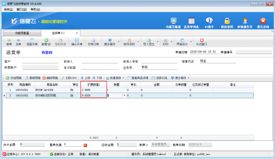 信管飛軟件支持用戶自己設置數據項顯示格式,比如:單價、金額、數量等單據界面顯示小數位格式,都可進行調整。本文介紹一下擴展數值的小數位如何設置? 在功能導航窗點擊“系統管理”—》“系統參數配置”—》“系統參數”,在“系統參數”界面可以設置數據項顯示格式,調整數量顯示格式擴展數值的也會改變,設置完之后點擊“保存”按鈕保存配置,如下圖所示: 數量顯示格式設置為“0.####”,在單據開單界面,擴展數值的顯示位數也就是四位,可以設置三位或者兩位小數位,如圖所