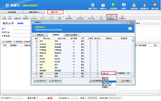 信管飛軟件支持自定義計算公式的設置,且這些公式按單據單獨管理,默認情況下僅對當前設置的單據生效。若需讓其他單據也應用相同的計算公式,軟件提供了快速同步功能,具體操作步驟如下: 演示視頻:自定義計算公式如何快速同步至其他單據? 首先,打開已完成計算公式設置的單據,點擊 “界面設計” 進入界面設計界面。接著,按住 “Ctrl 鍵” 并雙擊界面設計的表頭位置(藍色區域),此時會彈出提示 “您確認要將計算公式同步到其他同類單據?”,點擊 “確定” 后,將彈出