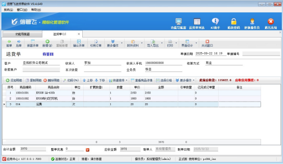 客戶業務中包含搬工費、跑腿費、運費等費用,使用信管飛軟件該如何在銷售單上顯示這些費用,并且同時計入到客戶應收款里面,本文以信管飛送貨單軟件介紹服務費該如何計入客戶應收款? 此文章相關演示視頻:客戶業務有服務費該如何計入客戶應收款演示視頻 在功能導航欄“基礎資料”----“商品信息”模塊下新增商品性質“服務及費用”的商品,商品名稱命名為“運費”,如下圖所示,搬工費和跑腿費操作方式一樣。 新開送貨單,添加商