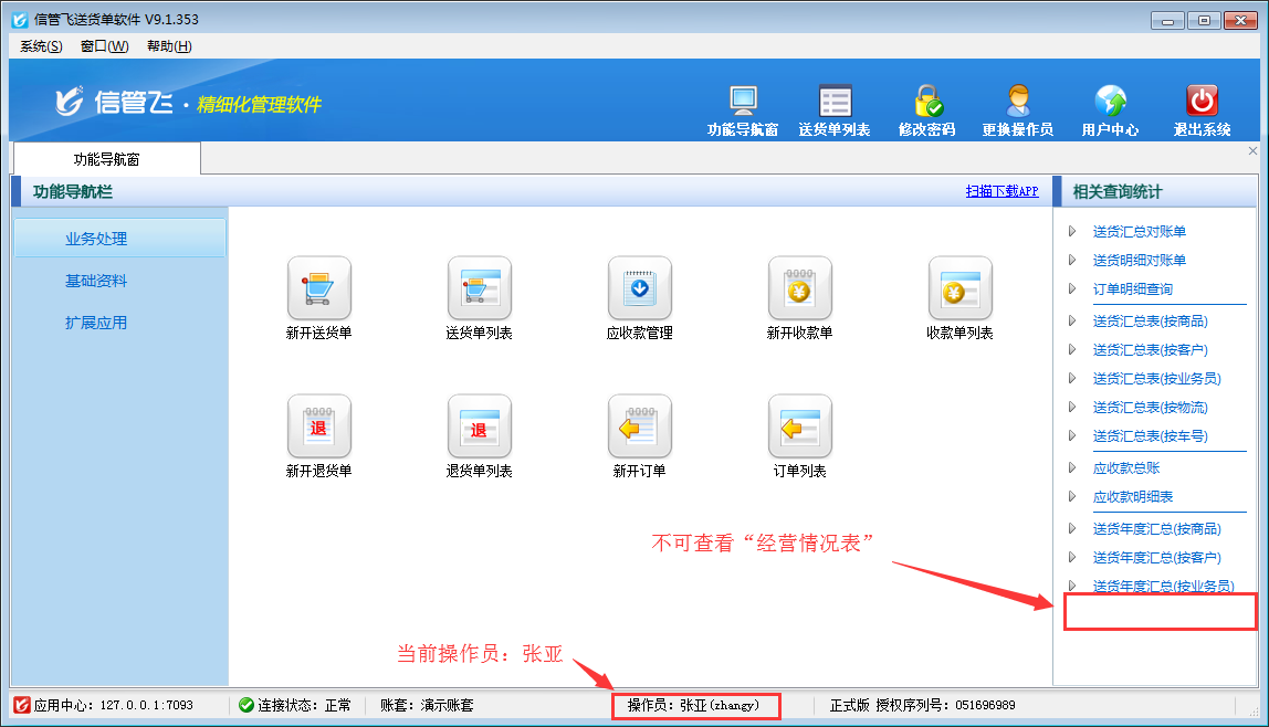 信管飛送貨單打印軟件是一款針對中小型企業開發的集送貨管理(發貨管理)、退貨管理(銷售退貨)、銷售收款(應收款管理)等功能為一體的送貨管理及打印軟件(送貨單打印軟件、發貨單打印軟件、出貨單打印軟件、收據打印軟件、貨單票據打印軟件)。 商品成本是計算企業盈虧的依據,送貨單軟件內可以維護每個商品的成本價及統計每日、每月經營情況、銷售毛利等(如下圖所示),如果不希望員工賬號登錄后查看經營情況,如何設置呢?本篇文章詳細介紹一下送貨單軟件內如何設置操作員不可查看經營情況? 登錄軟件,在功能導航窗點