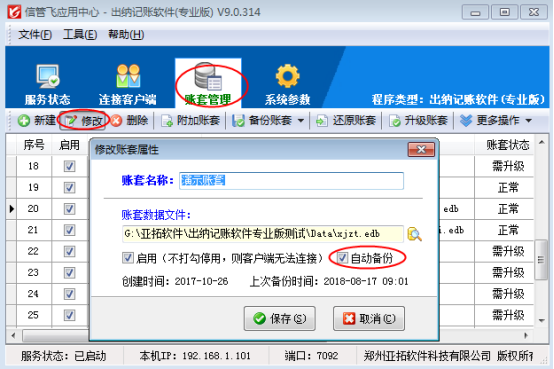 信管飛出納記賬軟件、信管飛送貨單軟件、信管飛RMS、信管飛倉庫管理軟件及信管飛票據(jù)軟件都支持設置賬套自動備份,我們強烈建議啟用自動備份功能,以便賬套出現(xiàn)問題的時候從賬套備份文件中恢復數(shù)據(jù)。下面我們以信管飛出納記賬軟件專業(yè)版為例詳細介紹一下如何啟用賬套自動備份功能? 首先打開軟件應用中心主界面,點擊“系統(tǒng)參數(shù)”—》“賬套備份參數(shù)”,可以打開賬套備份參數(shù)界面,賬套備份參數(shù)內可設置是否啟用自動備份、備份時間間隔和備份目錄,如圖1所示: 圖1 勾選
