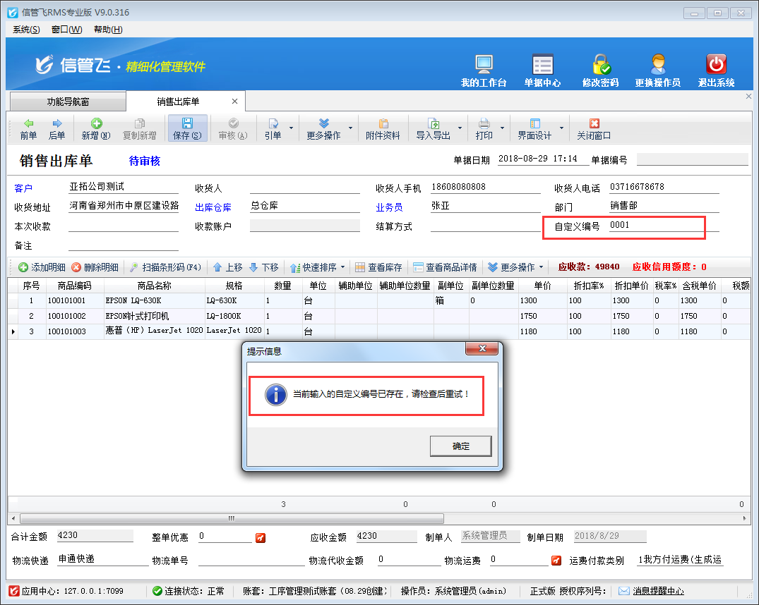 亞拓軟件自主研發(fā)的信管飛RMS、信管飛送貨單軟件、信管飛倉庫管理軟件等都支持開單后自動生成單據(jù)編號,另外,軟件也支持錄入自定義編號(不是單據(jù)編號),用戶可以在自定義編號內錄入訂單合同號等信息,為了避免錄入的自定義編號出現(xiàn)重復,軟件支持參數(shù)設置自定義編號不可重復。 以信管飛RMS為例,在“系統(tǒng)管理”—》“系統(tǒng)參數(shù)配置”—》“業(yè)務參數(shù)”內將“數(shù)據(jù)可否重復參數(shù)”中的“自定義單據(jù)編號可重復”參數(shù)的勾選取消,然后保存設置。如下圖1所示:圖1 設置完成后,打開功能導航窗的“銷售管理”—》“銷售出庫