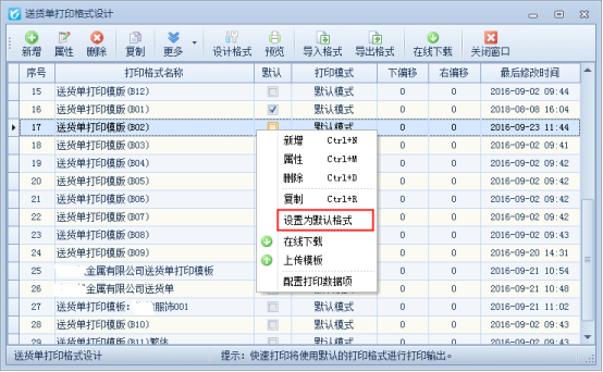 信管飛送貨單軟件、信管飛RMS軟件、信管飛倉庫管理軟件等,在開單界面都內置了好幾種打印格式,除此之外,軟件也支持自定義設計打印模板格式,為了開單打印單據(jù)方便,軟件可以把常用的模板設置為默認模板,開單保存后直接進行打印操作。不需要再次選擇模板進行打印。 本文以信管飛送貨單為例,示范下如何設置常用的打印模板為默認模板。首先先到打印模板設計界面,在開單界面,點擊工具欄中的“打印”按鈕下的“打印格式設計”進入送貨單打印格式設計界面,在此界面進行設置默認模板操作。有以下三種操作形式: