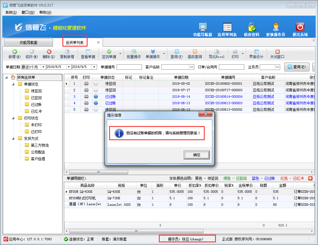 送貨單一般情況下是一式三聯(lián)(存根聯(lián)、客戶聯(lián)、回單聯(lián)),其中回單聯(lián)的作用是:在購買方收到商品核對完畢,與送貨單上的商品明細相符后,在回單聯(lián)上簽完名,由銷售方拿回,證明貨物已送達,買方確認已簽收。 信管飛送貨單軟件通過狀態(tài)控制實現(xiàn)簡單的流程管理(待簽回—》已簽回—》已結賬),本篇文章我們來介紹一下如何在軟件內設置操作員不可簽回、過賬送貨單? 信管飛送貨單軟件支持在送貨單列表對送貨單進行簽回、過賬操作。如果不允許操作員對送貨單進行簽回、過賬操作,可以取消操作員“簽回單據(jù)”、“過賬單據(jù)”的權限
