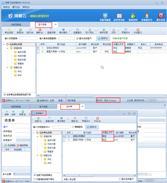 信管飛RMS軟件、信管飛倉庫管理軟件、信管飛送貨單軟件等都支持設置操作員權限,以控制操作員登錄軟件所顯示的功能,如公司需要限定操作員僅能查看和選擇自己所屬客戶信息,軟件中可以進行控制。 以“信管飛送貨單軟件”為例,示范下如何控制操作員僅能查看所屬為自己的客戶信息。首先需要在客戶信息中進行整理下客戶的所屬業務員信息,如下圖1所示,示例以員工“張亞”為例。 圖1 設置好客戶所屬業務員后,在功能導航窗選擇“系統管理”—》“操作員及授權”界面,添加