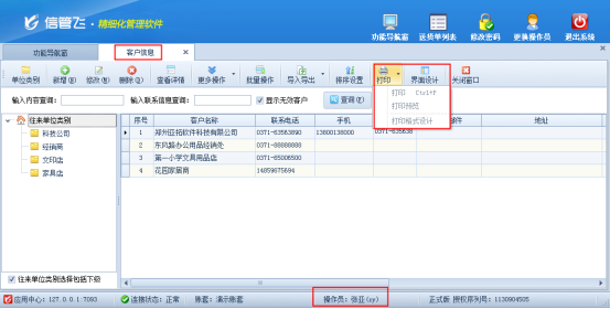 信管飛送貨單軟件、信管飛RMS、信管飛倉庫管理軟件等都支持管理基礎資料信息和允許設置多個操作員進行登錄軟件。軟件支持對基礎資料信息可以直接打印,為避免操作員打印客戶資料,本文以信管飛送貨單軟件為例,示范下如何設置操作員不可打印客戶信息。 在功能導航窗選擇“系統管理”—》“操作員及授權”界面,選擇操作員“張亞”,在功能模塊權限界面,選擇基礎資料“客戶信息”,在打印權限下,把打印權限取消勾選后保存權限,如下圖1所示: 圖1 此處設置好后,點擊“