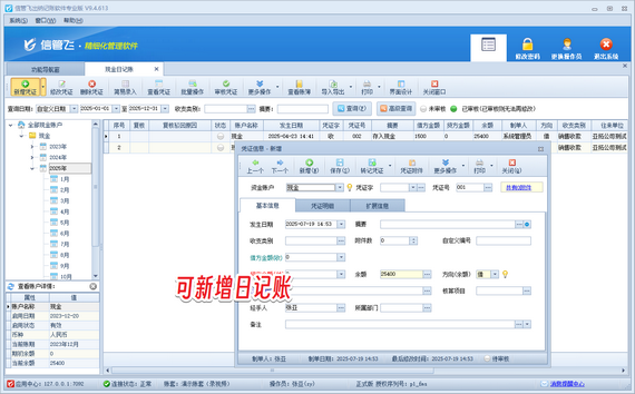 在數(shù)字化財(cái)務(wù)管理中,精準(zhǔn)的權(quán)限管理是保障數(shù)據(jù)安全與效率的核心。若操作員賬號(hào)登錄信管飛出納記賬軟件后無法新增日記賬憑證,通常源于權(quán)限配置未啟用。本篇文章為您呈現(xiàn)高效解決方案。 使用系統(tǒng)管理員賬號(hào)登錄軟件,在功能導(dǎo)航窗點(diǎn)擊“系統(tǒng)管理”—》“操作員及授權(quán)”打開操作員管理及授權(quán)界面,選擇操作員賬號(hào),在其右側(cè)的功能模塊權(quán)限內(nèi)選擇“出納管理”,將現(xiàn)金(銀行)日記賬的“新增”權(quán)限勾選上,然后保存權(quán)限設(shè)置,如下圖所示。 權(quán)限設(shè)置完成后,更換操作員賬號(hào)“張亞”重新登錄軟件,即可新增現(xiàn)金(銀行)日記賬,如