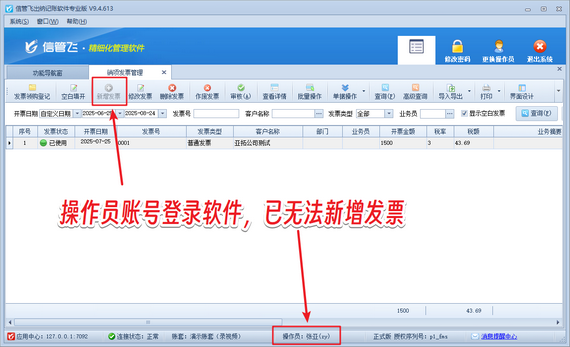 在數(shù)字化財(cái)務(wù)管理中,權(quán)限細(xì)分是企業(yè)內(nèi)控的關(guān)鍵一環(huán)。信管飛出納記賬軟件以用戶需求為導(dǎo)向,推出“操作員不可登記進(jìn)銷項(xiàng)發(fā)票”功能,幫助企業(yè)實(shí)現(xiàn)財(cái)務(wù)流程的精準(zhǔn)管控。這一設(shè)計(jì)直擊傳統(tǒng)記賬軟件權(quán)限模糊的痛點(diǎn),讓財(cái)務(wù)分工更清晰、數(shù)據(jù)更安全。 演示視頻觀看鏈接:出納記賬軟件如何設(shè)置操作員不可新增進(jìn)銷項(xiàng)發(fā)票演示視頻 系統(tǒng)管理員賬號(hào)登錄軟件,在功能導(dǎo)航窗點(diǎn)擊“系統(tǒng)管理”—》“操作員及授權(quán)”,進(jìn)入“操作員管理及授權(quán)”界面,選擇操作員賬號(hào)“張亞”,在其右側(cè)的功能模塊權(quán)限內(nèi)選擇“票據(jù)管理”模塊,將進(jìn)/銷項(xiàng)發(fā)票管