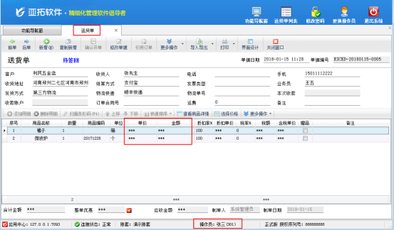 信管飛送貨單軟件(原“紅管家送貨單軟件”)支持多個操作員登錄使用軟件,可以對不同的操作員設置不同的權限。有些客戶不允許操作員查看商品銷售價,軟件支持在“操作員管理及授權”中設置操作員不能查看銷售價格,下面我們詳細介紹一下操作員不可查看商品銷售價的設置方法。 登錄信管飛送貨單軟件,在功能導航窗點擊“系統管理”—》“操作員及授權”,即可進入“操作員管理及授權”界面,如圖1所示,以操作員“張三”為例,鼠標選中操作員后,點擊“其他操作權限”,取消勾選“查看商品銷售價”,然后點擊“保存權限設置”即可。圖1 操作員管理及授權界面&n